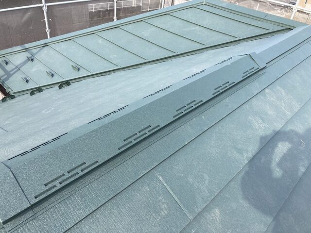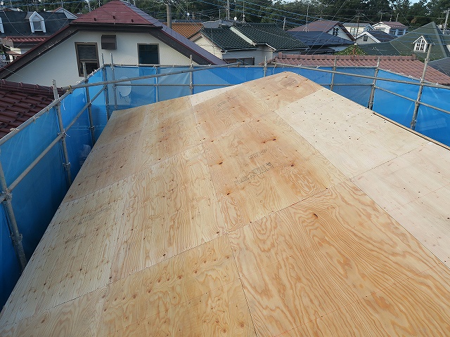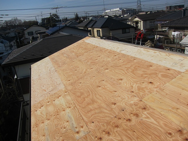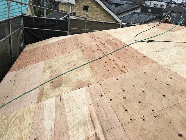 今回の葺き替え工事では、瓦棒屋根に、ラーチ下地という針葉樹の合板を設置してから、新たな瓦棒屋根に葺き替えています。