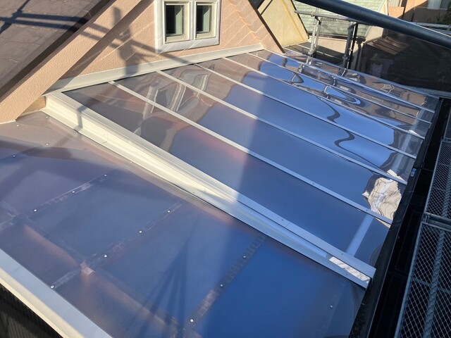 そこで、古いアクリル板を取り外し、新しいポリカの屋根材を取り付ける工事を行いました。
