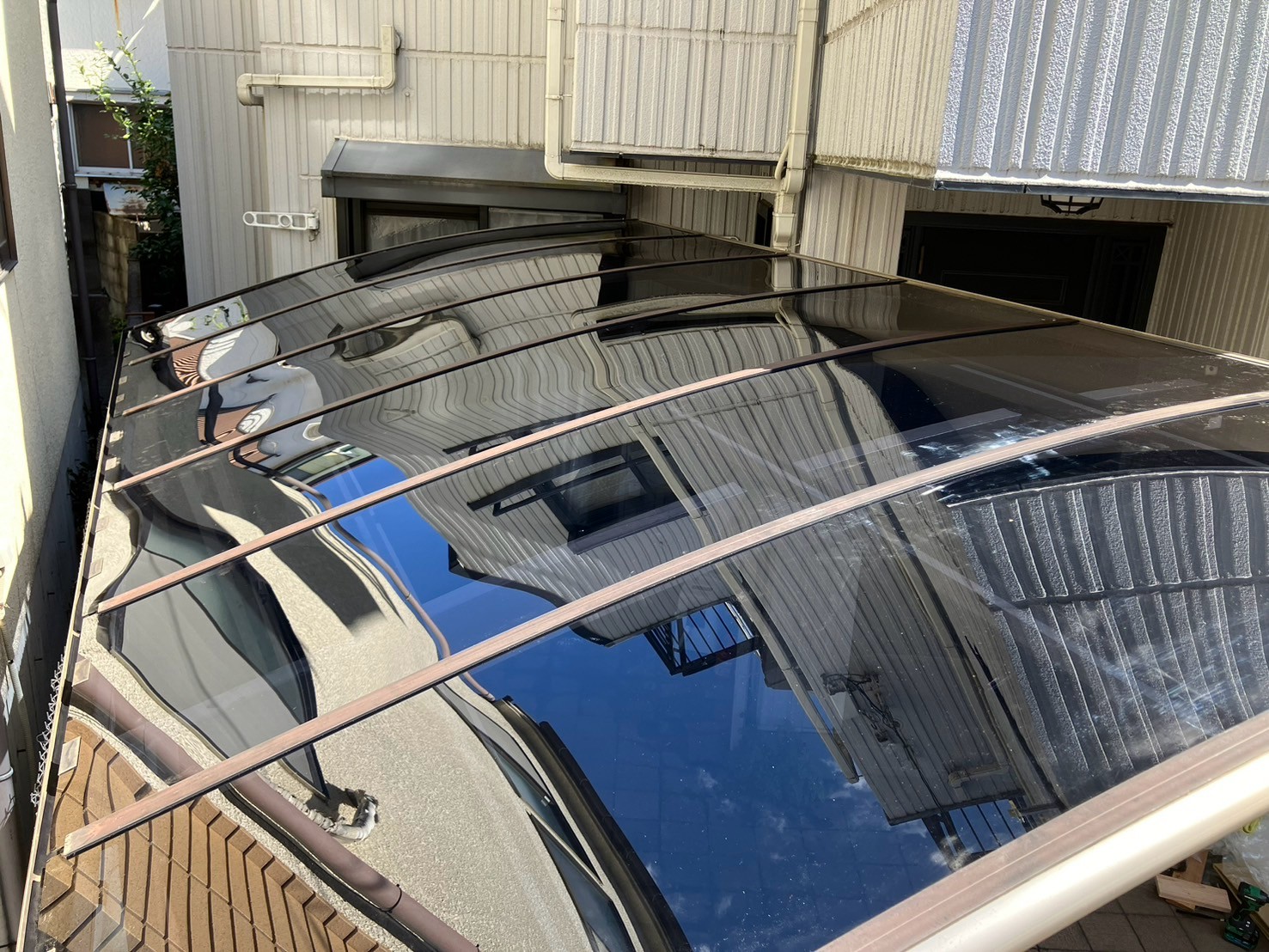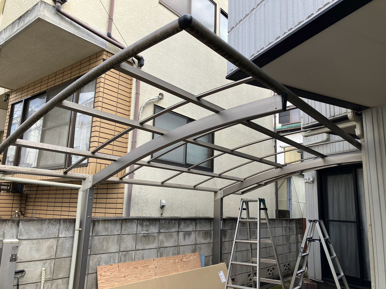 - 既存のアクリル板を撤去し、新規のポリカーボネイト屋根を設置