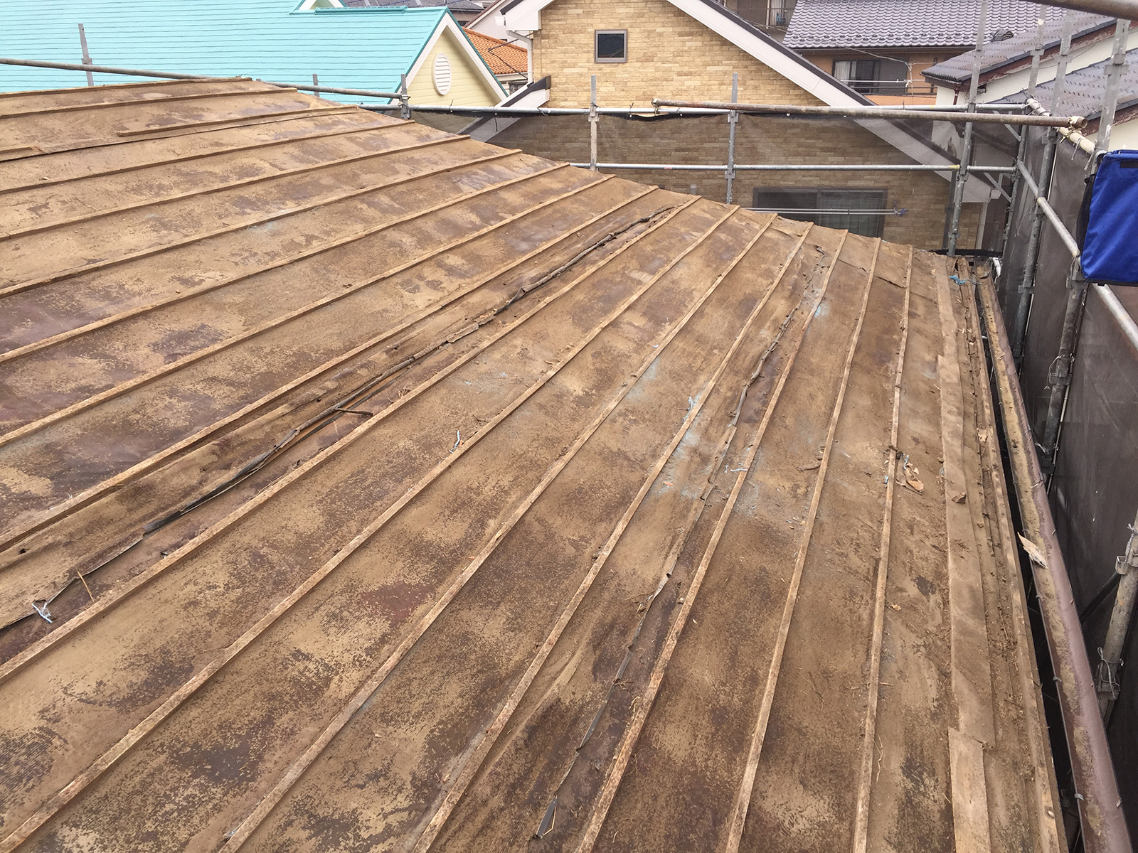 - 雨漏りがしている瓦屋根で、また地震対策として瓦から軽い屋根にしたいというご相談があり調査をした。瓦屋根から軽量な屋根に葺き替えをご提案。