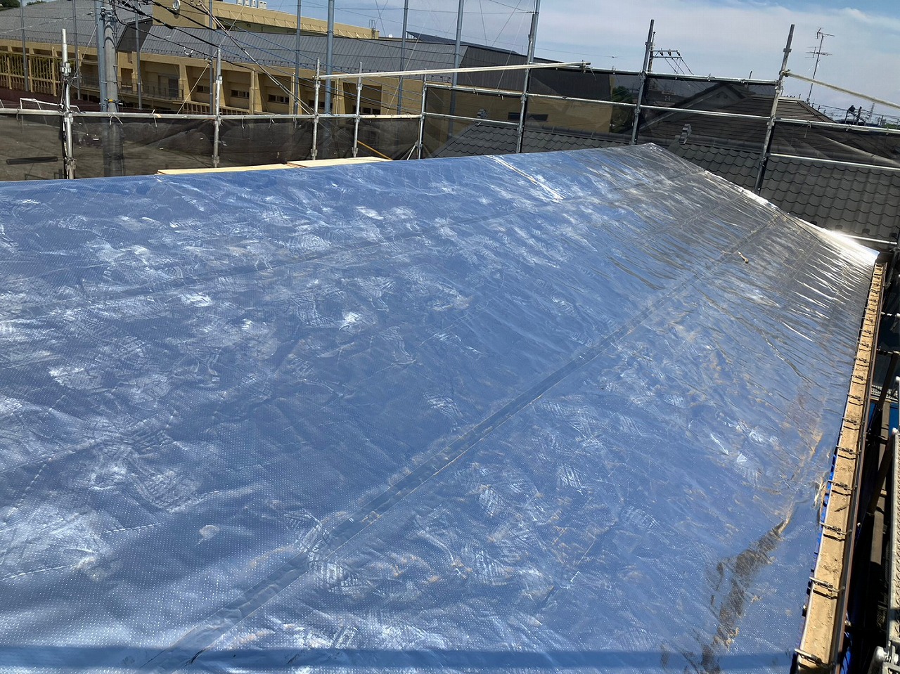 - 屋根が雨漏りしてたので地元のウチノ板金さんに相談をした。瓦屋根ではなく軽い金属屋根へ葺き替えをご希望。また夏場の厚さ対策としてアルミ遮熱シートを屋根の中にいれることを提案。