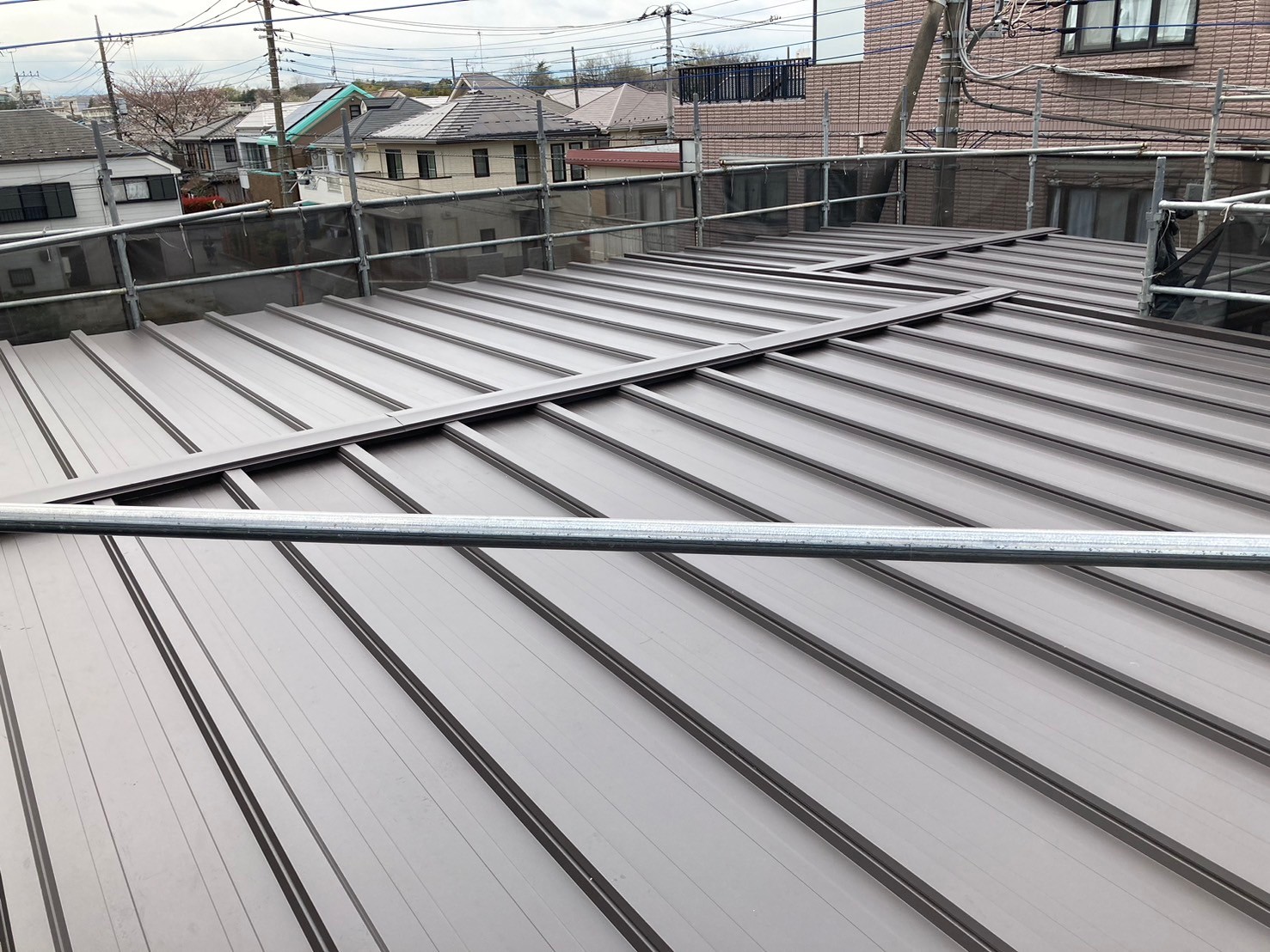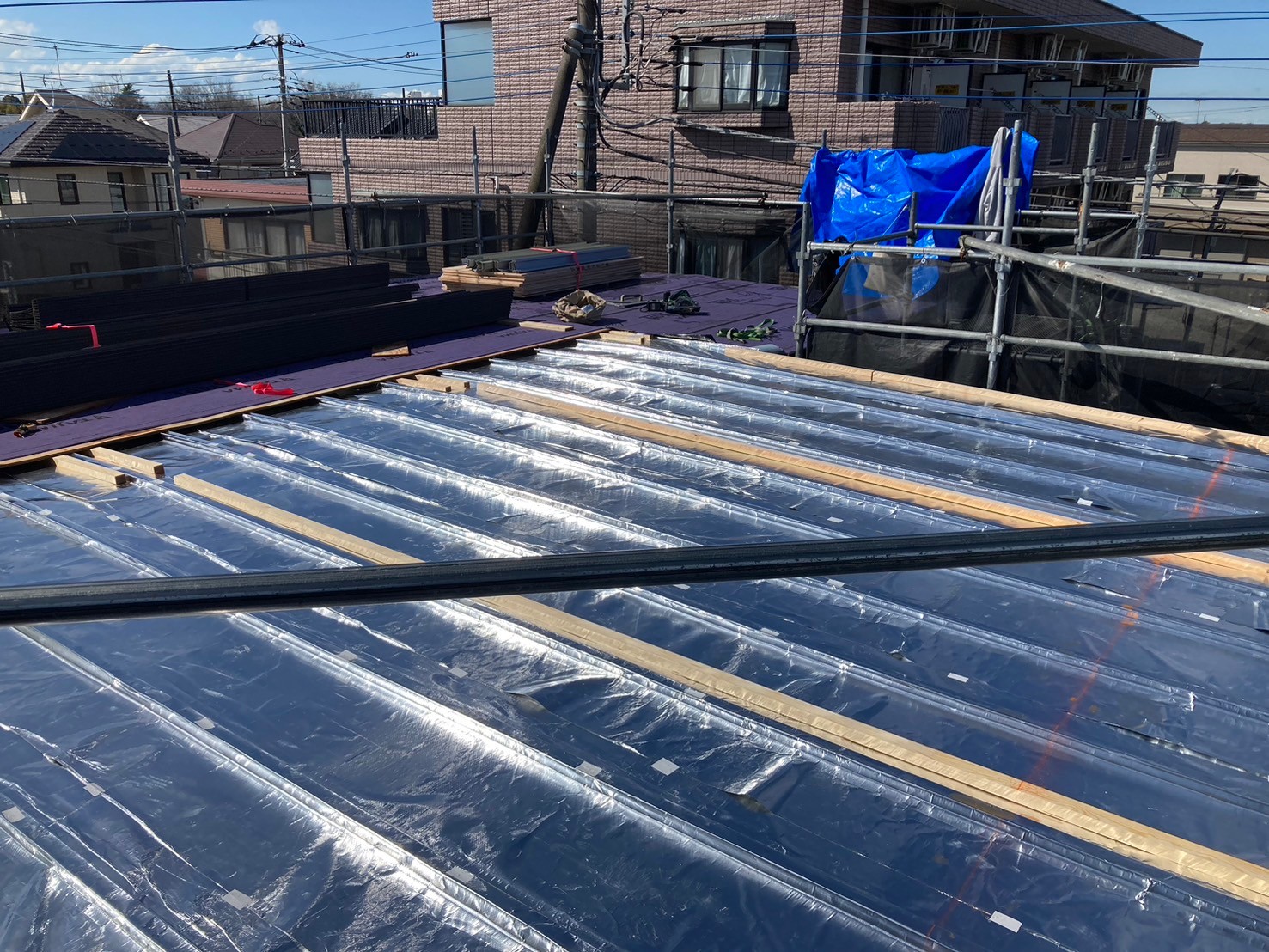 - 既存のトタン屋根に遮熱アルミ材を貼り、ガルバリウム鋼板を仕上げでカバー。
