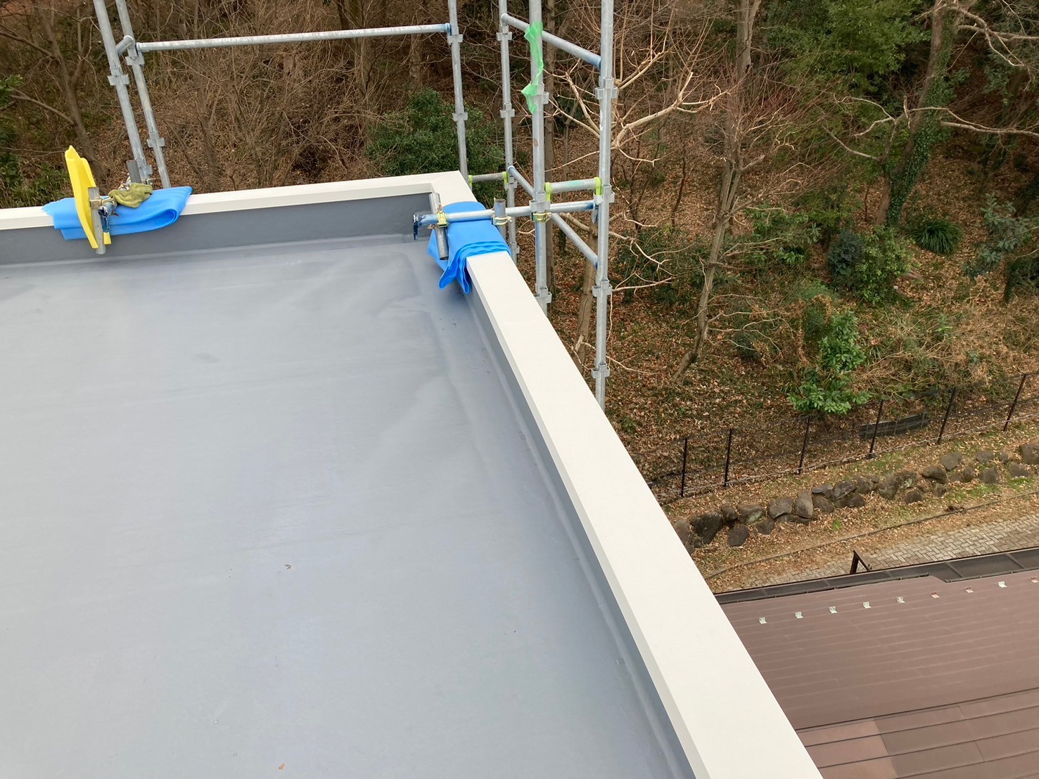 - 古い板金の笠木を撤去後、防水工事をし、新規の板金笠木を取り付け